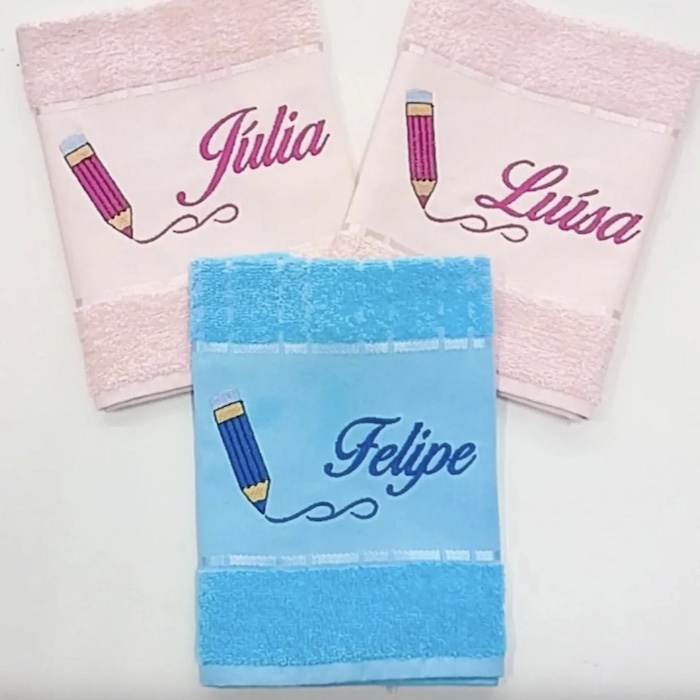 Com o nosso kit de toalhas de banho personalizadas, você torna o seu banheiro muito mais especial! Bordamos o nome que você quiser em uma toalha de banho e uma toalha de rosto nas cores azul ou rosa, criando o presente perfeito para seus filhos, amigos e parentes.
